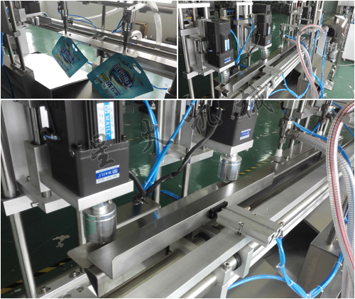 5、該機(jī)的自動旋蓋裝置采用磁力+齒輪旋蓋、壓力可調(diào),袋蓋緊實不遺漏、具有自動打滑功能使旋蓋松緊適當(dāng)。